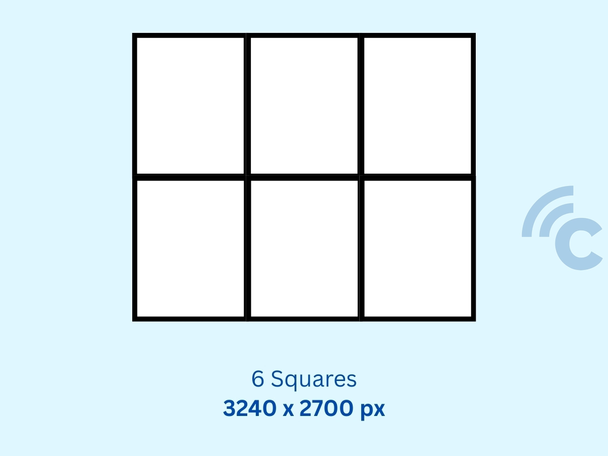 Six squares are often used to share a more detailed story or to display an artwork divided into six parts. To keep the details sharp, make sure your images have a high resolution. For this layout, use at least 3240 x 2700 pixels with a 6:5 aspect ratio.