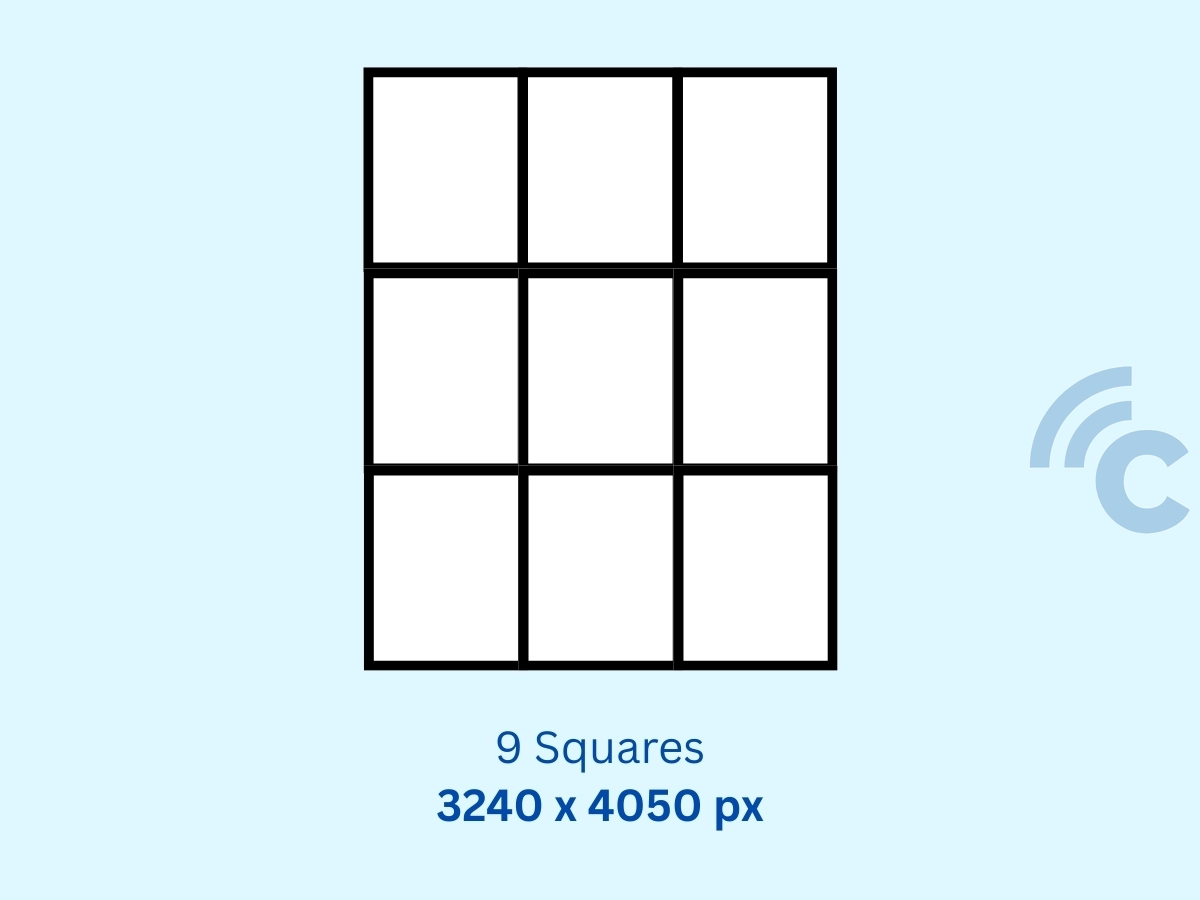 Nine squares are usually chosen for big announcements or promotions. A 3x3 grid creates a neat and eye-catching design for anyone visiting your profile. The aspect ratio is the same as a single post (4:5), but for the best quality, use images with at least 3240 x 4050 pixels resolution.