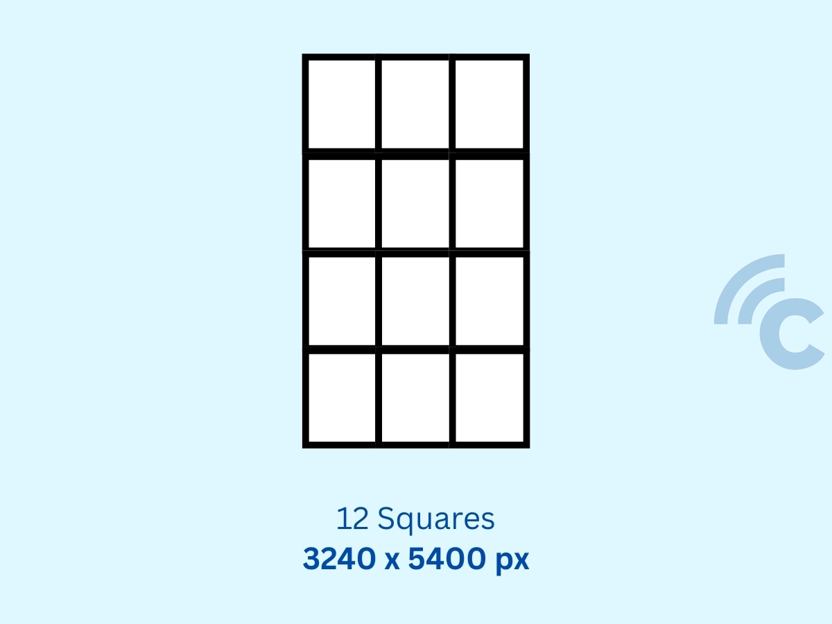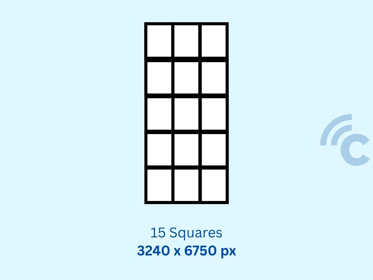 Fifteen squares work well if you want to share a very detailed visual or story. With more space, each section can stand out while still being part of a bigger picture. For this format, use a vertical image with at least 3240 x 6750 pixels resolution and a 12:25 aspect ratio.