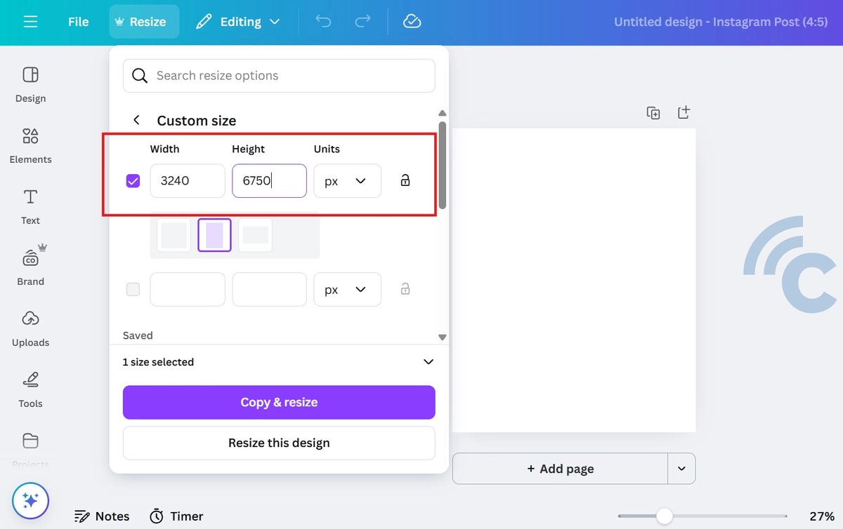 Click on “Resize” in the top right corner and select “Custom size.” Enter the size based on the design you want to make. For example, if you want a 15-grid feed, set the canvas to 3240 x 6750 pixels.