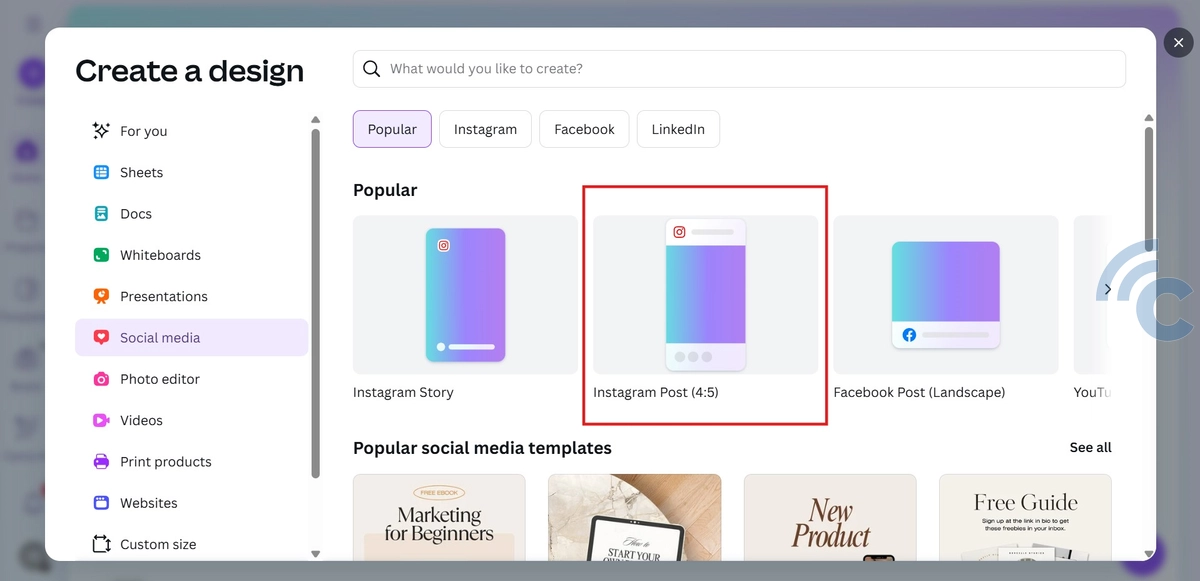 Open Canva on your phone or laptop. If you do not have an account, create one first. If you already have one, log in. Canva offers many templates that you can customize. For Instagram feeds, choose one of the “Instagram Post” templates.