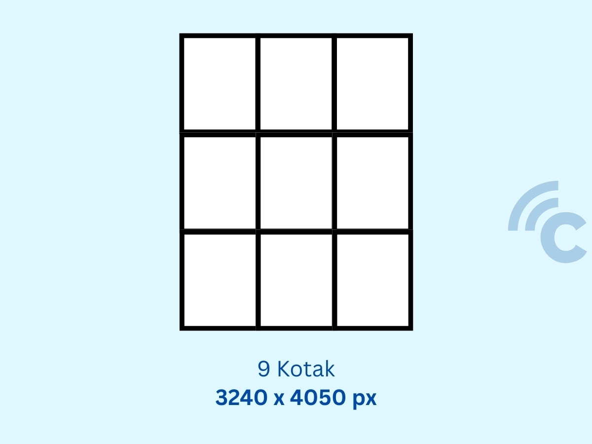 Aspek rasio untuk 9 kotak ini sebenarnya sama seperti aspek rasio untuk 1 kotak yaitu 4:5. Namun untuk mendapatkan kualitas maksimal, pastikan Anda untuk menggunakan gambar dengan resolusi minimal 3240x4050 piksel.